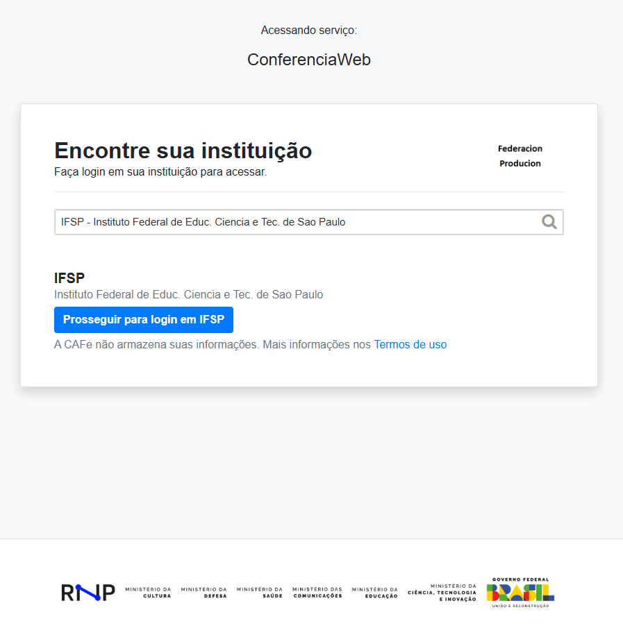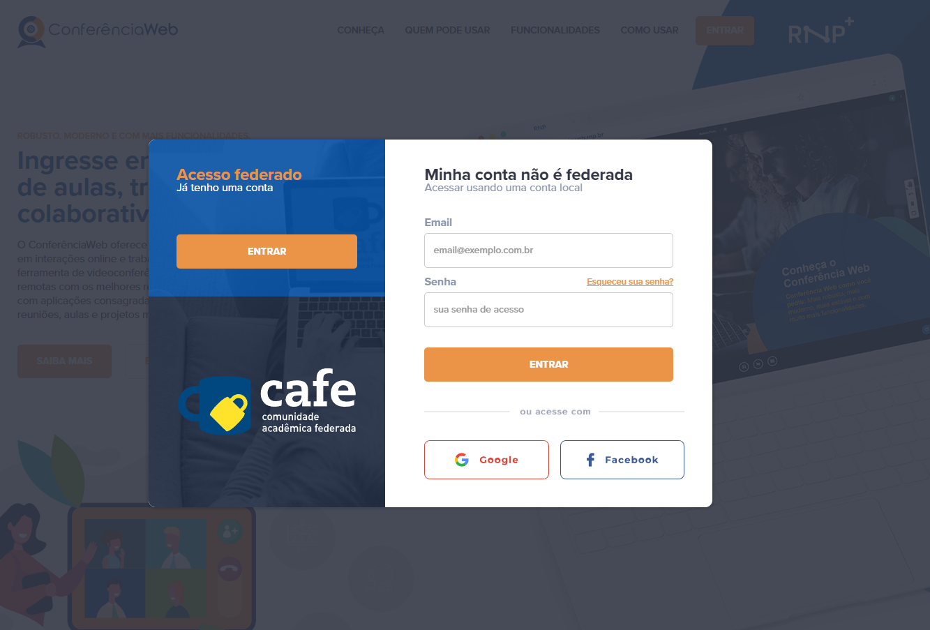 Utilize o "Acesso Federado (CAFe)" para realizar o login com as credenciais da sua instituição.