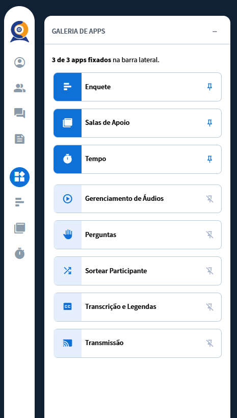 Na barra lateral esquerda, clique no ícone Galeria de Apps (quatro quadradinhos) e depois em Transmissão.