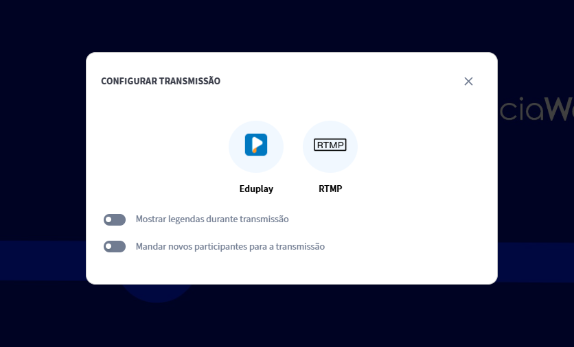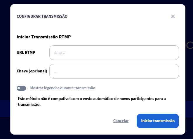 Será exibida a janela Configurar Transmissão. Escolha a opção RTMP.