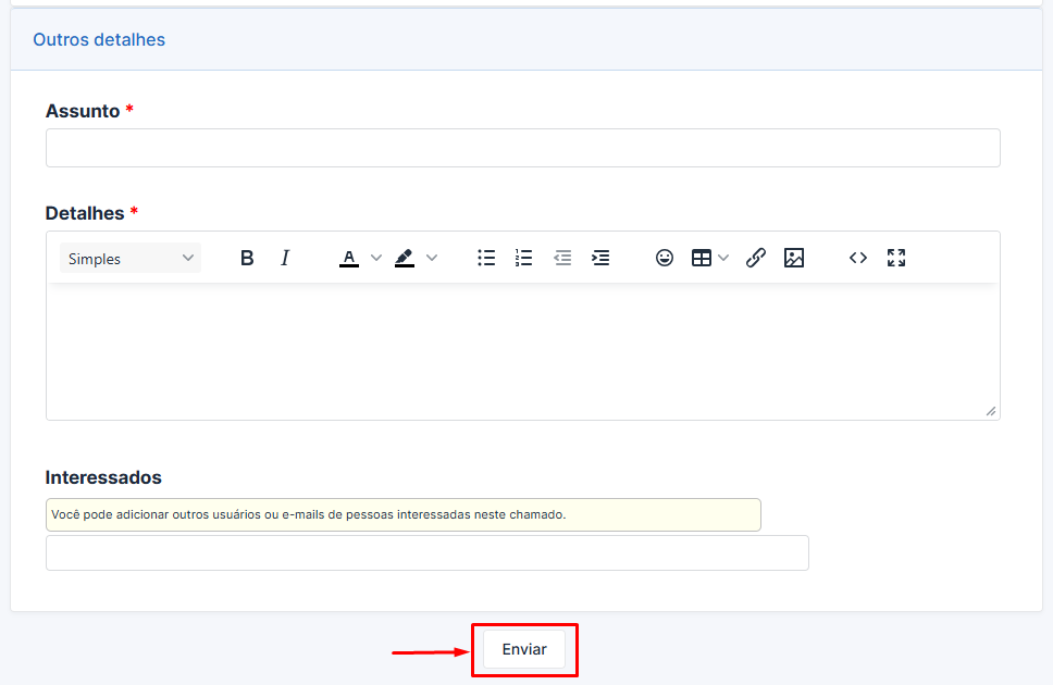 Dica: No campo Interessados você pode incluir outras pessoas envolvidas no problema. Assim, elas também conseguem acompanhar o andamento do chamado diretamente no GLPI.